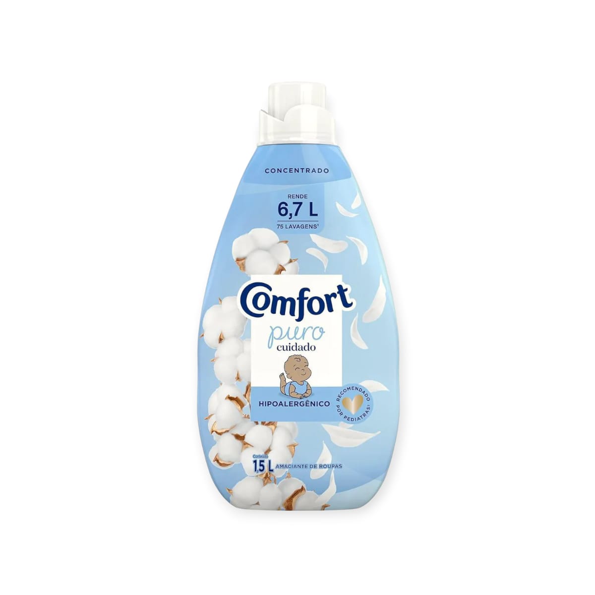 O Amaciante Concentrado Comfort Puro Cuidado com perfume suave com extrato de aveia é recomendado para peles delicadas e ajuda a prolongar a vida útil das roupas.
